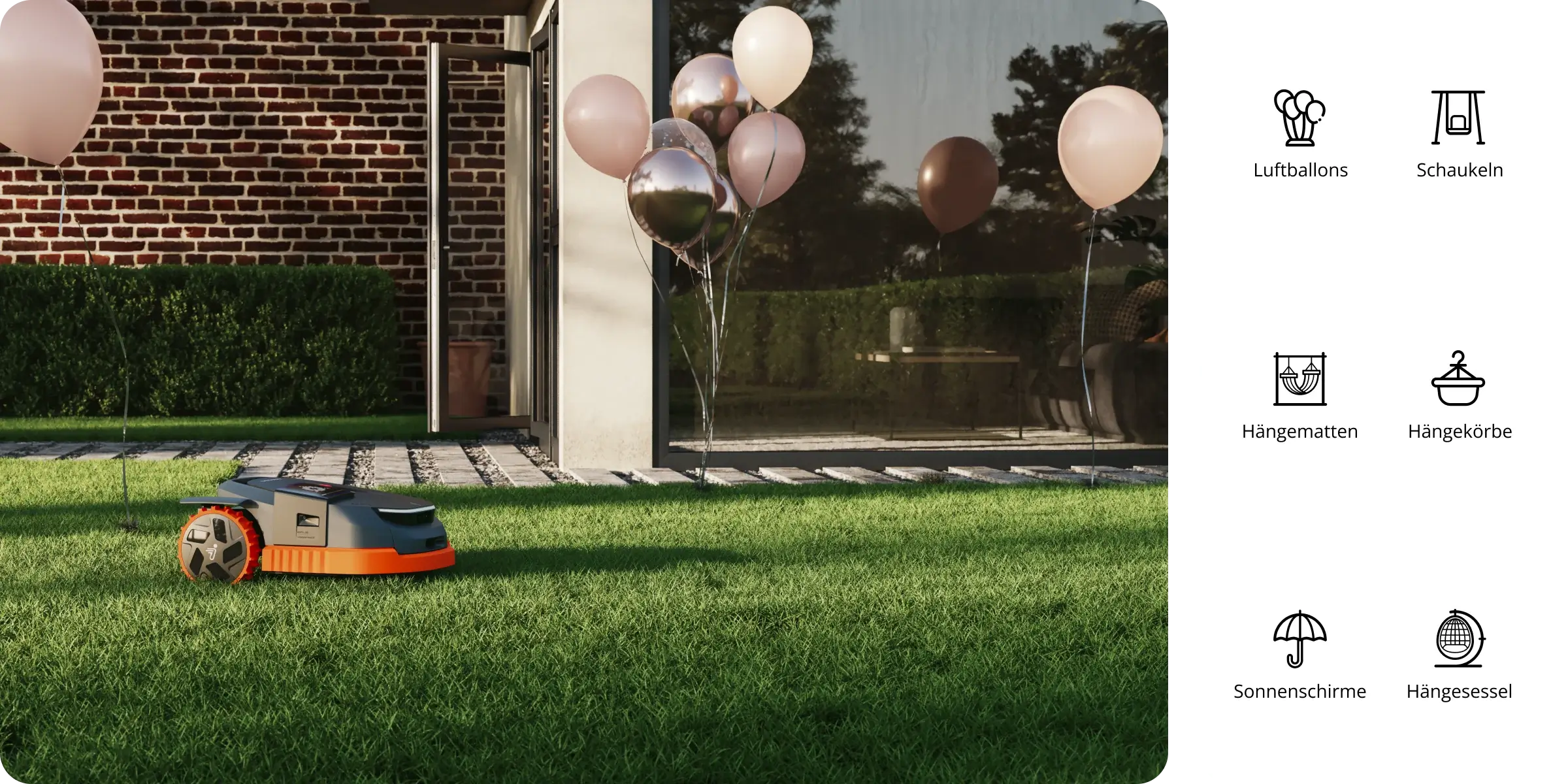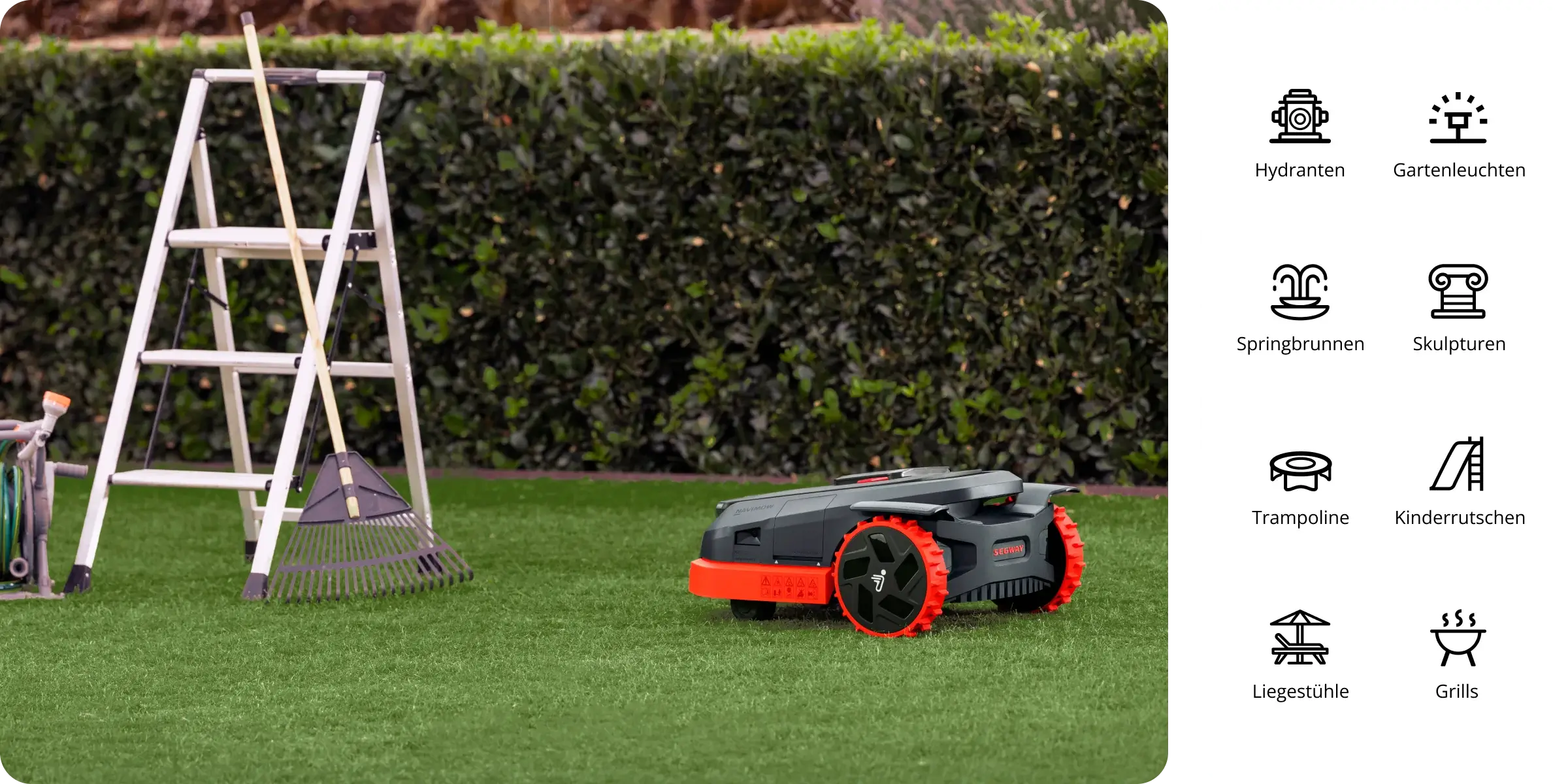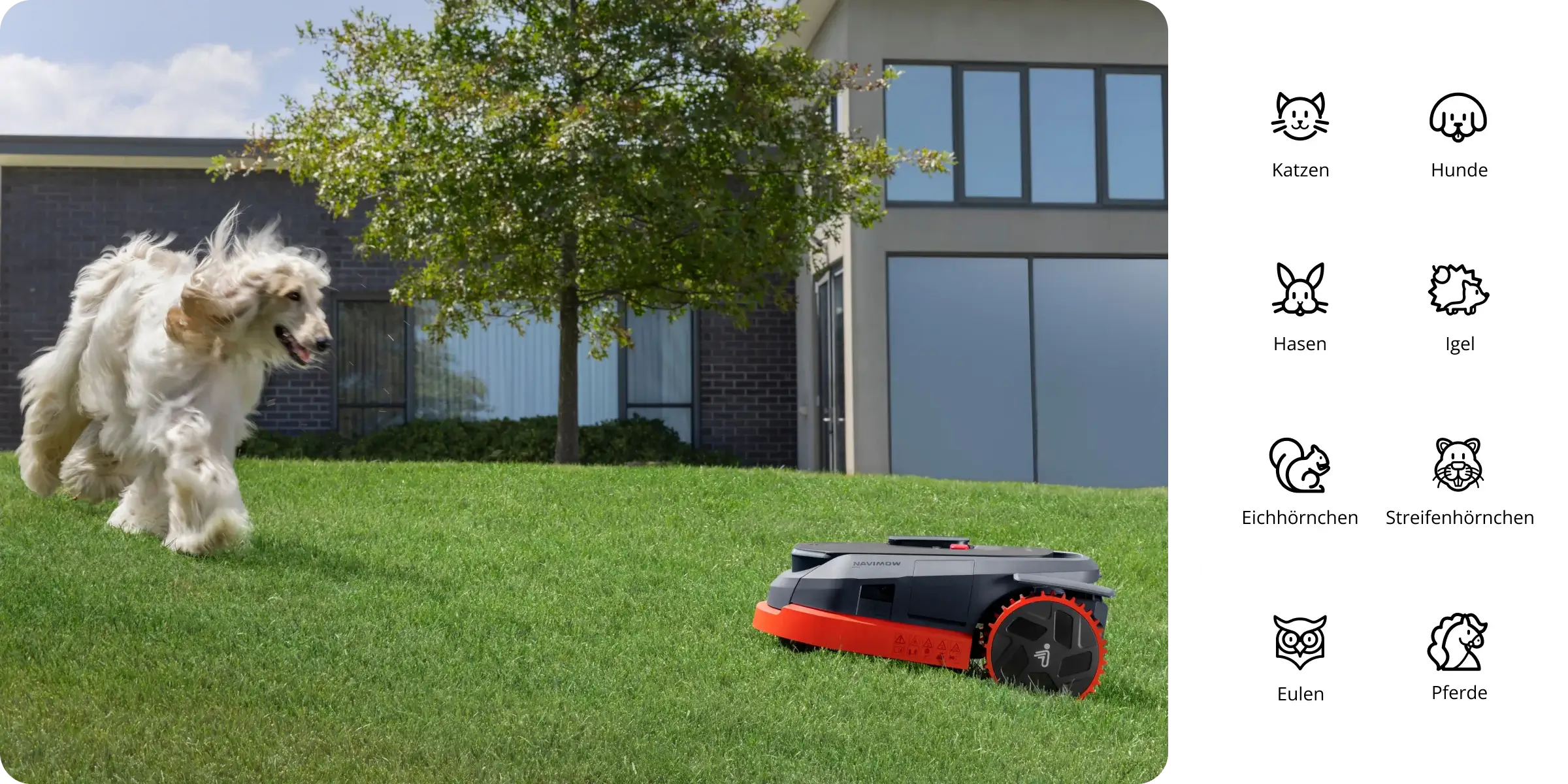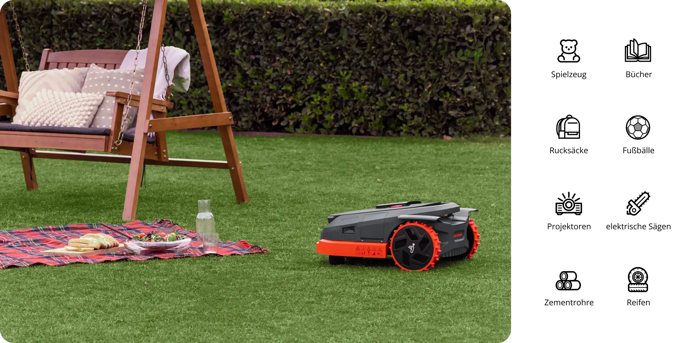 Dank fortschrittlicher Algorithmen erkennt und vermeidet der Mähroboter über 200 verschiedene Hindernisse, darunter feste Objekte, Haustiere, Gartenmöbel und sogar hängende Gegenstände wie Schaukeln oder Luftballons. Diese visuelle Erkennung sorgt für eine sichere Navigation und präzise Hindernisvermeidung, was das Risiko von Kollisionen minimiert und den Mähvorgang effizienter gestaltet.
