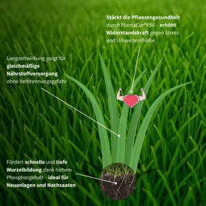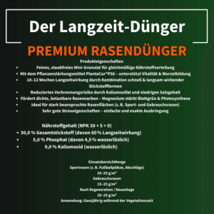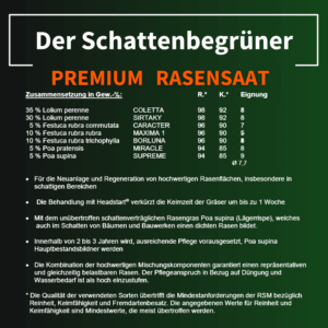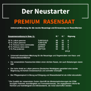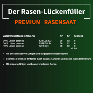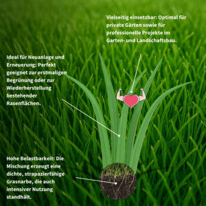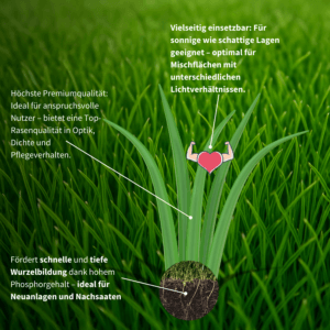 Premium-Qualität: Sorgfältig abgestimmte Mischung aus Lolium, Festuca und Poa für dichten, strapazierfähigen Rasen