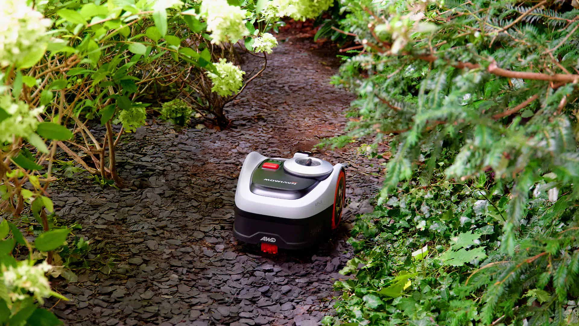 Unser Garten hat mehrere Hänge und enge Stellen. Der i210E AWD meistert alles ohne zu zögern