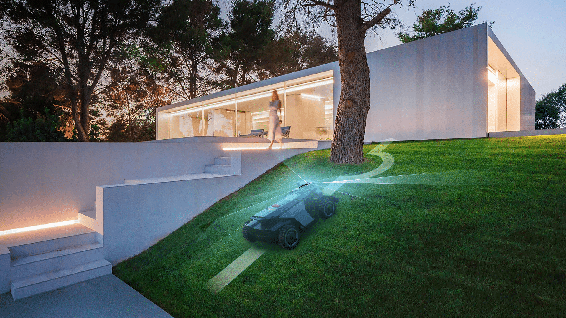 - Zentimetergenaue Navigation mit EFLS™ N-RTK – präzises Schnittbild auch in sehr komplexen Gärten, unter Bäumen und in schmalen Passagen